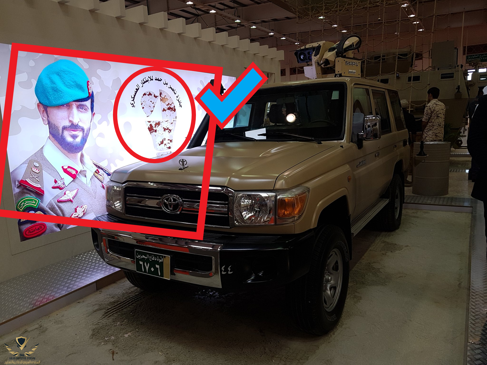 أنظروا إلى الشعار الموجود خلف العربتين في الصورة: بمعنى أن هاتين العربتين وكل ما يوجود في هذا المكان بالصالة يخص ابتكارات الشباب والبنات العسكريين في قوة دفاع البحرين ضمن جائزة ناصر بن حمد للابتكار العسكري، ولا يعني بأن هاتين العربتين تستخدمان لدى قوة دفاع البحرين، هما مجرد مشاريع ابتكارية قد تستخدم وقد لا تستخدم، الهدف تشجيع وتحفيز الشباب على الابتكار العسكري،