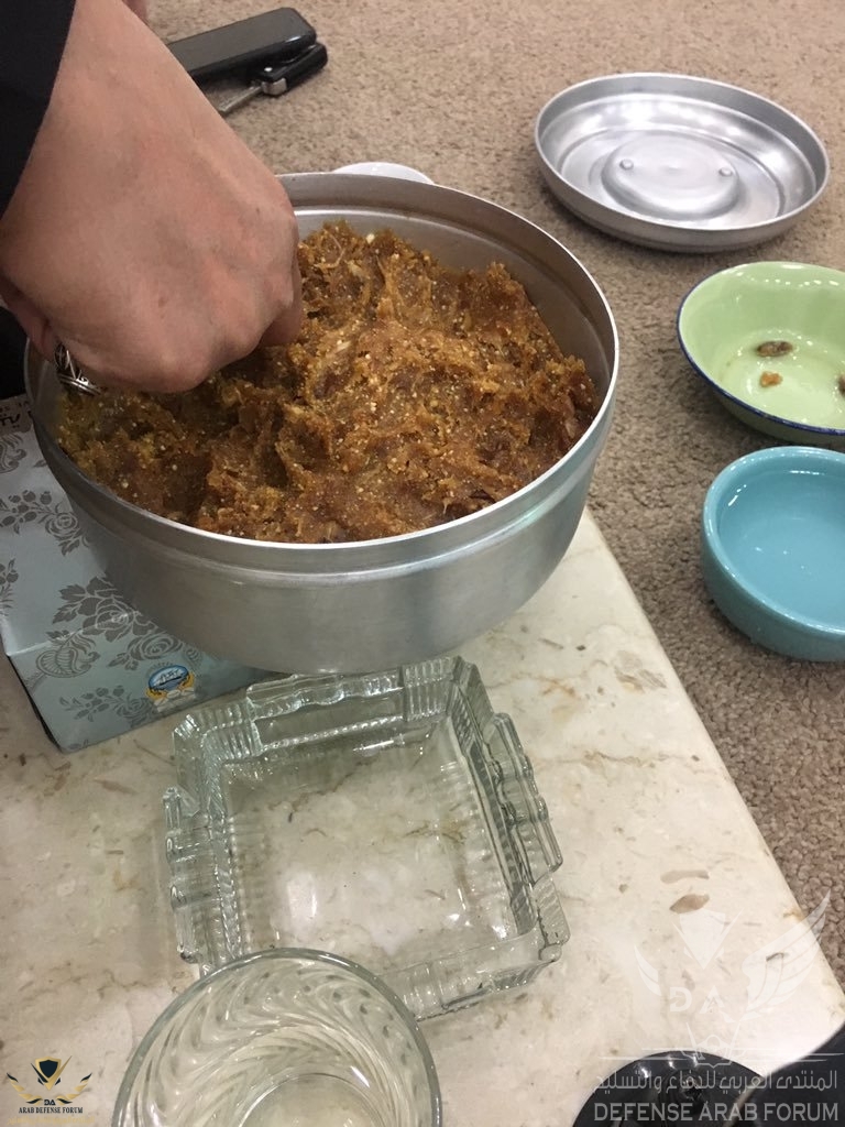 تمر ومضير للمتحركين في الجبال ياكل وهو يمشي تحتوي على طاقة كبيرة ولاتتلف قناصة الجبال يستخدمونهاللاسف جيش كالجيش السعودي ذو الميزانية البالغة 80 مليار دولار والجيش لا يملك وجبات جاهزة مخصصه له كهذه .
