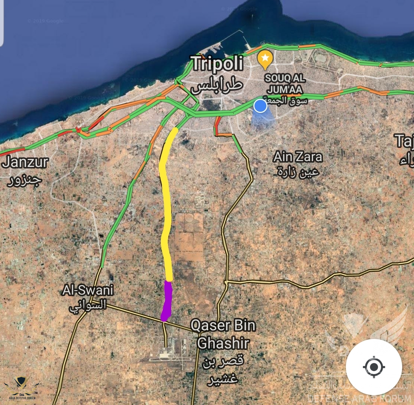 طريق المطار طويلة وما تسيطر عليه مليشيا حفتر منها موضع بالبنفسجي بينما ما يسيطر عليه الجيش و الثوار موضع بالأصفر