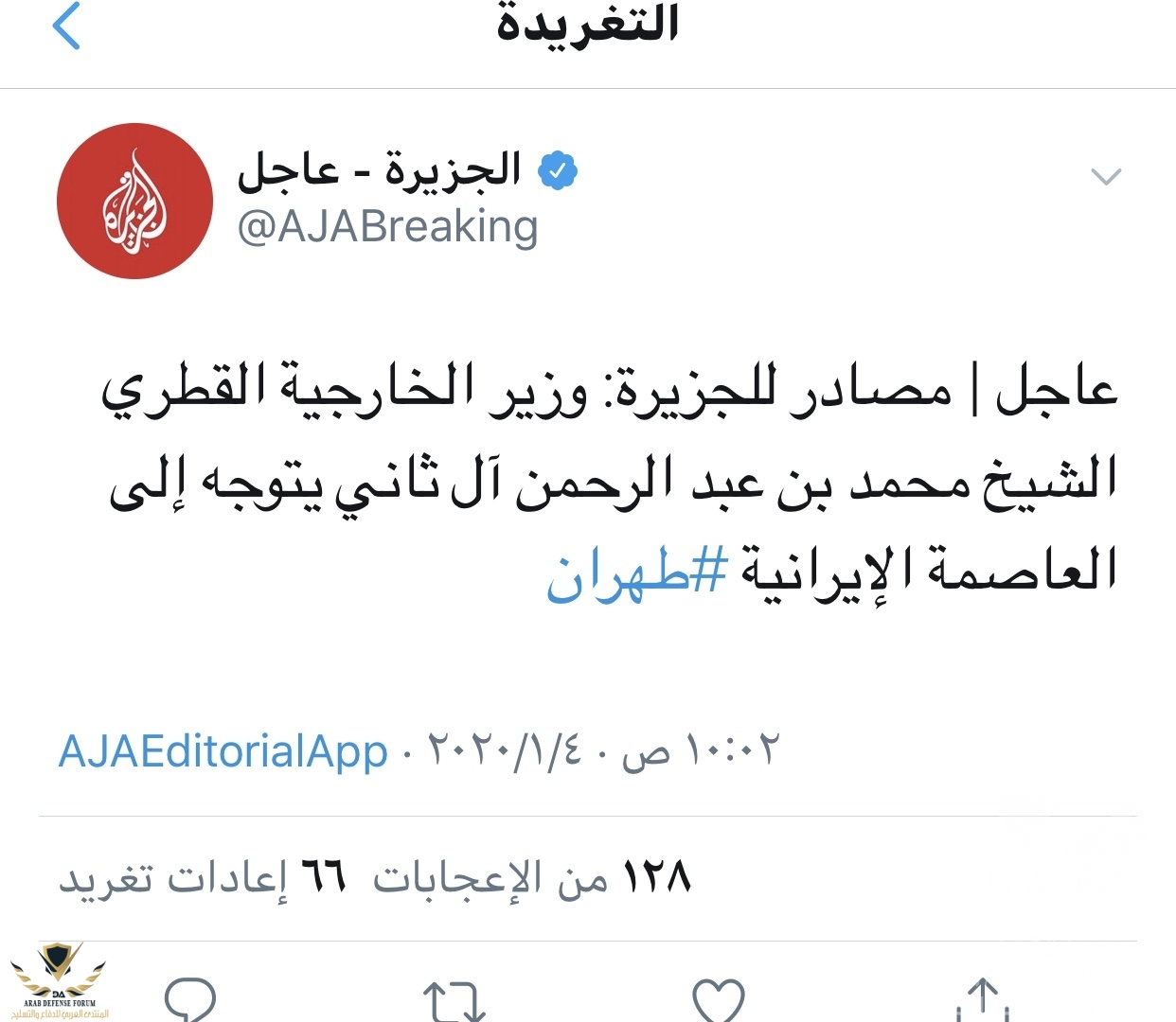 قناة روسيا اليوم/ ‏وزير الخارجية القطري الشيخ محمد بن عبد الرحمن آل ثاني يتوجه إلى العاصمة الإيرانية - عاجل