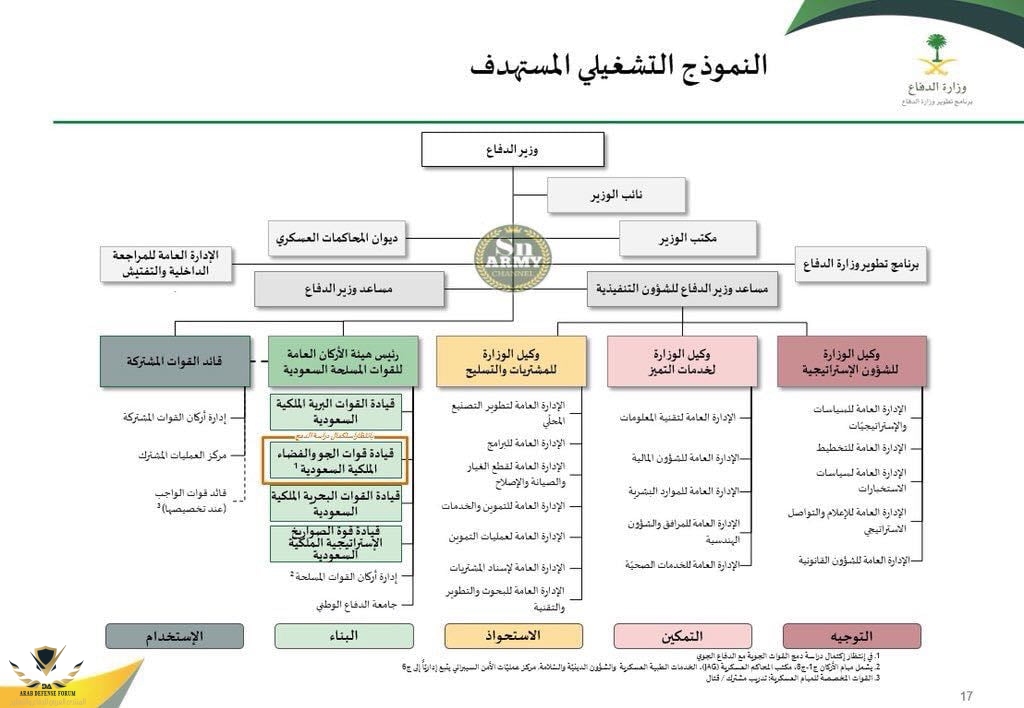 هيكلة وزارة الدفاع مع بعض التعديلات مثل القوات البرية والبحرية اصبح مسماها رئيس اركان القوات البريه ونفس الامر للبحرية مع دمج الجوية والدفاع الجوي