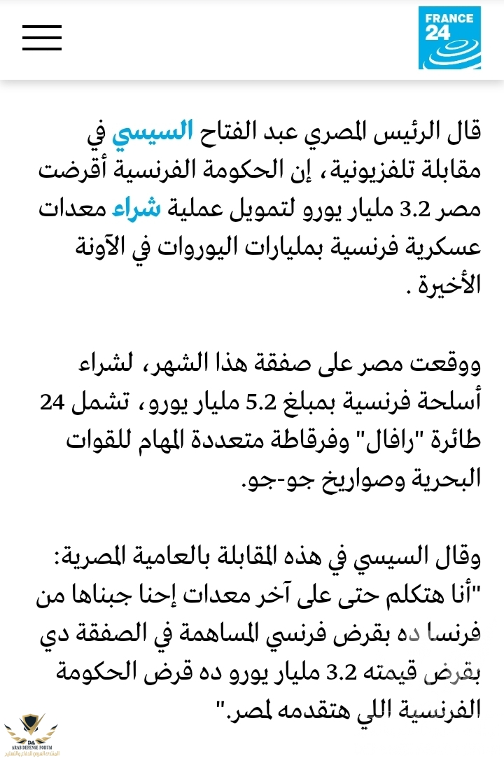 الجريدة لا اقصدها الكل يعلم بها لكن اشير للغضو المصري المشارك في الصرف الصحي نسا ان بلده ايضا الرفال ومجموعة من الاسلحة الفرنسية بقرض المضحك عنوانه معتقدا انه سيستفزنا ههههه