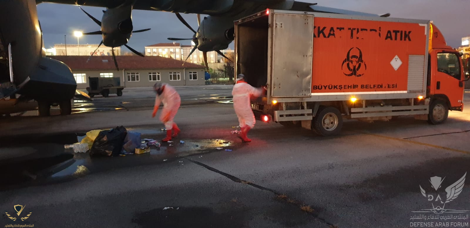 تعقيم وتطهير طائرة a400m التي نقلت 42 شخص من ووهان إلى تركيا وتضم أتراك وأذربيجان وجورجيين