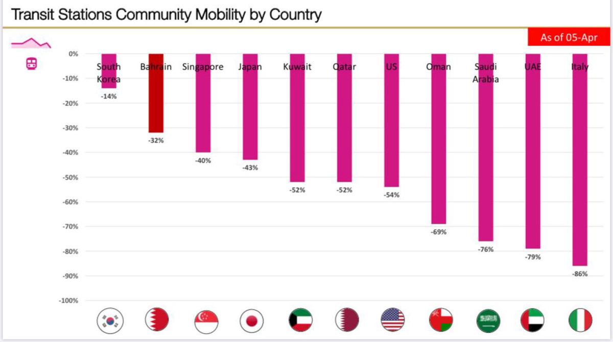 اظهرت بيانات نشرها محرك البحث العالمي «غوغل» ان مملكة البحرين بمجتمعها الواعي حققت ارقام ونتائج افضل من نظيراتها بدول مجلس التعاون الخليجي والدول العربية، فيما يتعلق بالتباعد الاجتماعي لمجابهة فيروس كورونا، بالرغم من استمرار حرية التنقل للضرورات المعيشية في مملكة البحرين، واستمرار فرض حظر التجول في تلك الدول.
