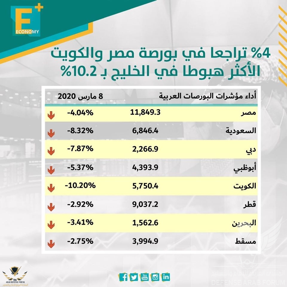 إنخفاض الأسواق مرده لعدم تجديد إتفاقية الخفض بين دول أوبك+انهارت أسواق المال الخليجية في تعاملات اليوم، وخسرت البورصة السعودية أكبر أسواق المنطقة 8.3%، لتصل خسائرها 18.4% من بداية العام، بينما تراجعت بورصة مصر بنحو 4%، لتتراجع القيمة السوقية للبورصة اليوم الأحد نحو 17.4 مليار جنيه وتسجل 627 مليار جنيه