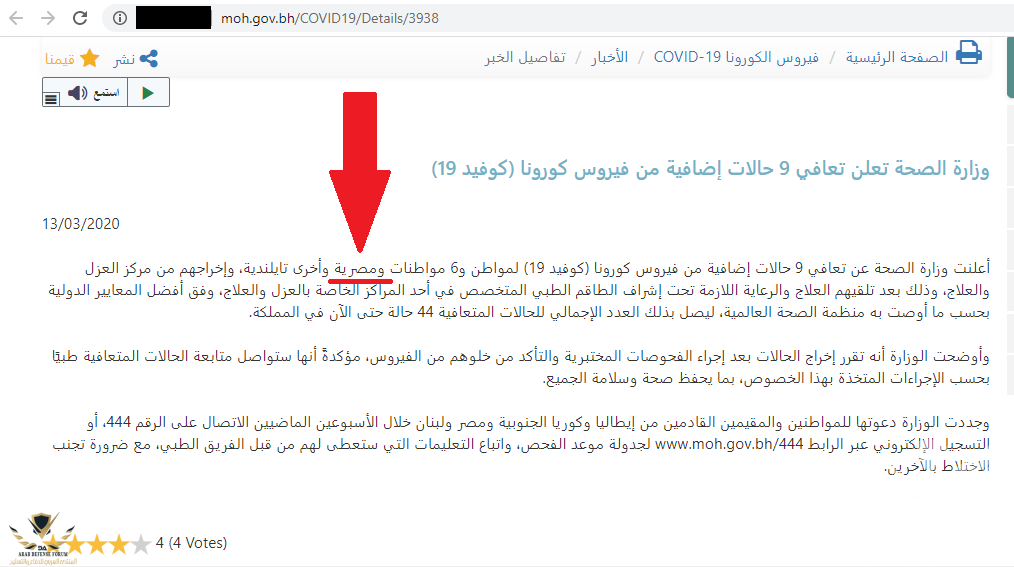 الآن الذي سمعته يوم أمس أن يوم الخميس 12 مارس ذهبت طواقم طبية مع الشرطة البحرينية لمدرسة مدينة عيسى الثانوية للبنين وأخذوا مدرسين مصريين إثنين، وأخذوهم للحجر الصحي، لا أعرف هل هؤلاء كانوا مسافرين لمصر خلال الأسبوعين الماضيين؟ أم أن وزارة الصحة اكتشفت إصابة جديدة لمصريين ممن كانوا في مصر خلال الأسبوعين الماضيين وهؤلاء المدرسين الـ 2 اختلطوا مع من اكتشفت فيهم الاصابة،