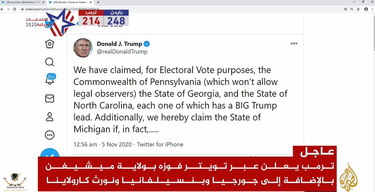 بعكس النتائج الأولية المعلنة.. ترمب يعلن عبر تويتر فوزه بولاية ميشيغن بالإضافة إلى جورجيا وبنسيلفانيا ونورث كارولاينا، وموقع تويتر يضع علامة تحذيرية على التغريدة لتضمنها معلومات قد تكون مضللة.