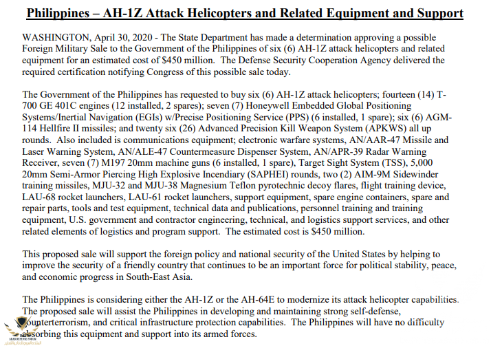 وافقت وزارة الخارجية الأمريكية على بيع محتمل لطائرتي هليكوبتر مختلفتين إلى الفلبين قبل القرار النهائي لبلد بشأن المروحية التي ستشتريها