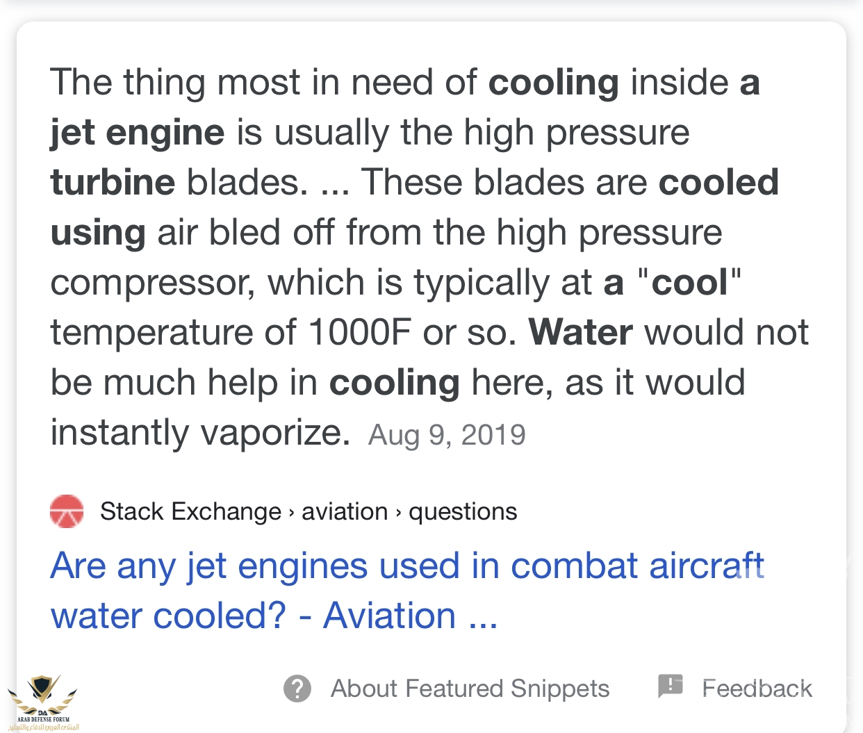 يا راجل! مش مهندس انا لكن ازاي يتم حقنه بالماء ومحركات المقاتلات لا تستخدم الماء؟لأن قلب المحرك يتم تبريده عن طريق الماء المحقون ، عشان كده غرف الاحتراق غير قادرة على حرق كل مزيج الوقود والماء ، لذلك يتم تنفيس بعض جزيئات الوقود والماء من المحرك ، والذي يتجسد في شكل الخاصية دخان اسود.