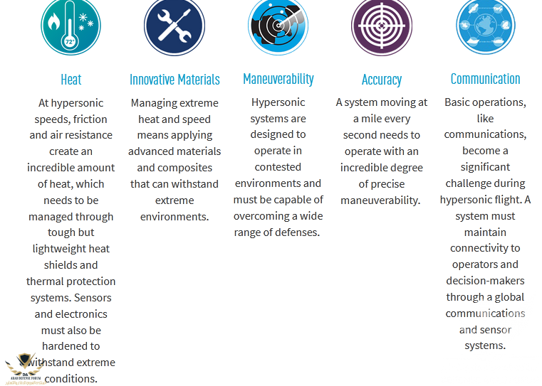 خامسا: الاتصالات: تصبح العمليات الأساسية مثل الاتصالات تحديًا كبيرًا أثناء الطيران الذي تفوق سرعته سرعة الصوت. فيجب أن يحافظ النظام على الاتصال بالمشغلين وصناع القرار من خلال أنظمة اتصالات وأجهزة استشعار شاملة.