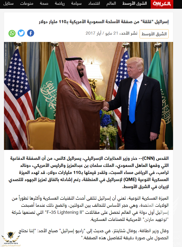 شراء الأسلحة من امريكا و دول اورباايوة يا اخى انا بسأل اى نوعيه منعت عن السعودية مش قوبلت بانزعاج اسرائيلى لان ده طبيعى انما انزعاجها شئ ومنع الاسلحه عن المملكة شئ اخر