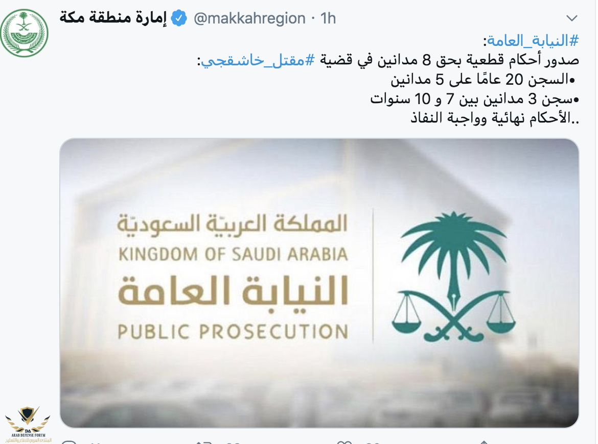 عام / النيابة العامة : صدور أحكام نهائية بحق ثمانية أشخاص مدانين في قضية مقتل جمال خاشقجي وكالة الأنباء السعودية