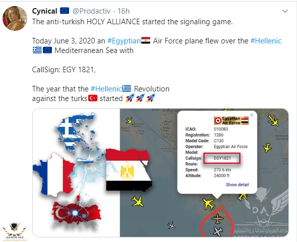 صورة نشرها بعض الحسابات الأجنبية المهتمة بتتبع حركة الطائرات على تويتر توضح وجود طائرات C-130 مصرية (غالبا نسخة الاستطلاع الالكترونى) بالأمس تقوم بعمليات استطلاع فوق المتوسط بالقر ب من اليونان