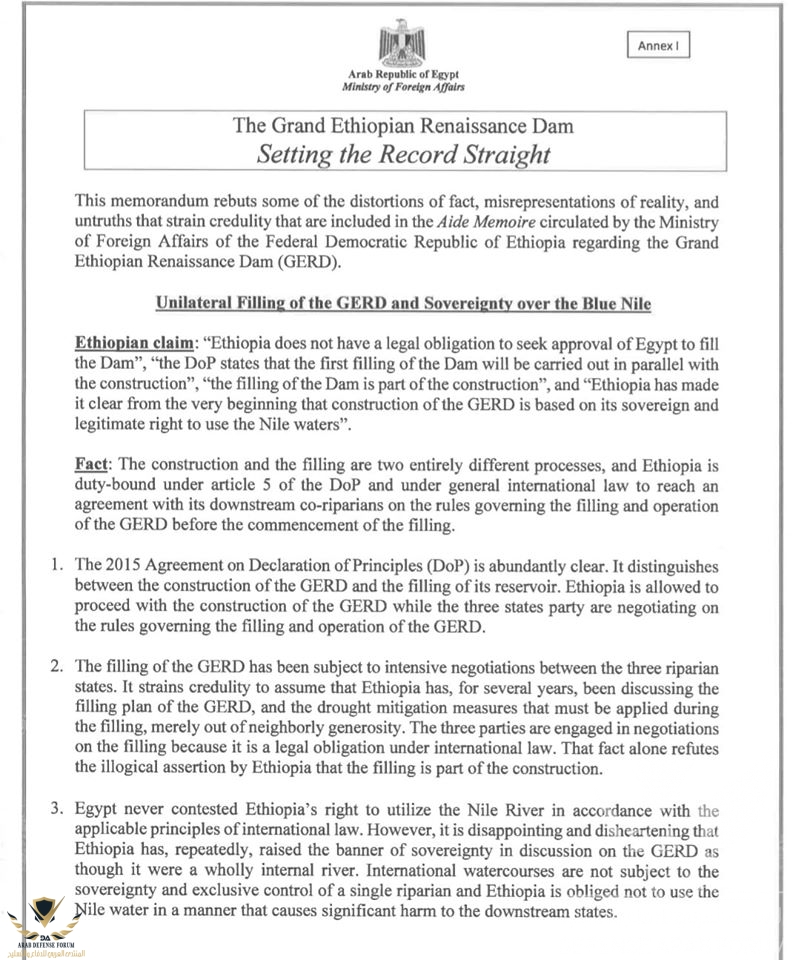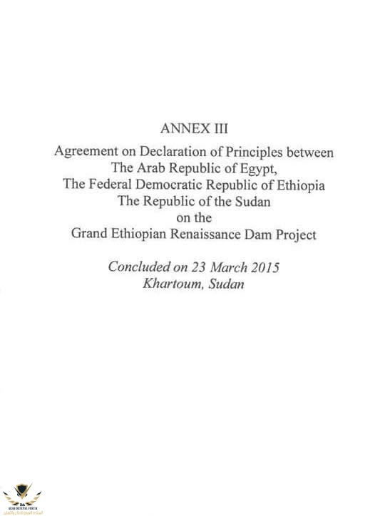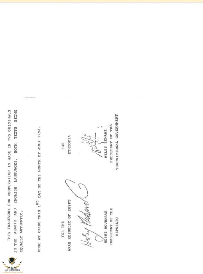 ١٠- تم وضع النص الكامل لاتفاقية عام ١٩٩٣ الموقعة بين مصر واثيوبيا وبتوقيع الرئيس الاسبق مبارك و رئيس وزراء اثيوبيا الاسبق ميليس زيناوى وفيها تتعهد اثيوبيا بعدم الاضرار بمصر والاحترام الكامل للاتفاقيات المنظمة لمياة النيل وعدم قيام اى طرف بمشروع على ارضه من شأنه الحاق الضرر بالطرف الاخر .