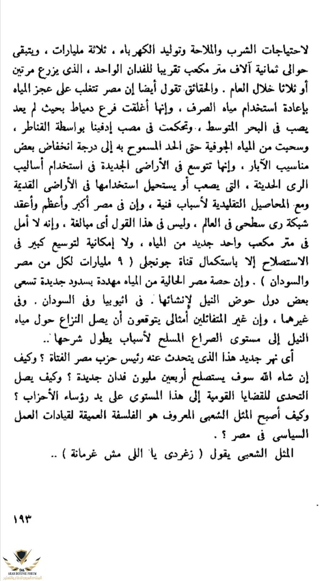 - ويقول أيضا: الحقيقة إن مصر منذ ثلاثين سنة تتغلب على عجز المياه بإعادة استخدام مياه الصرف الصحي.