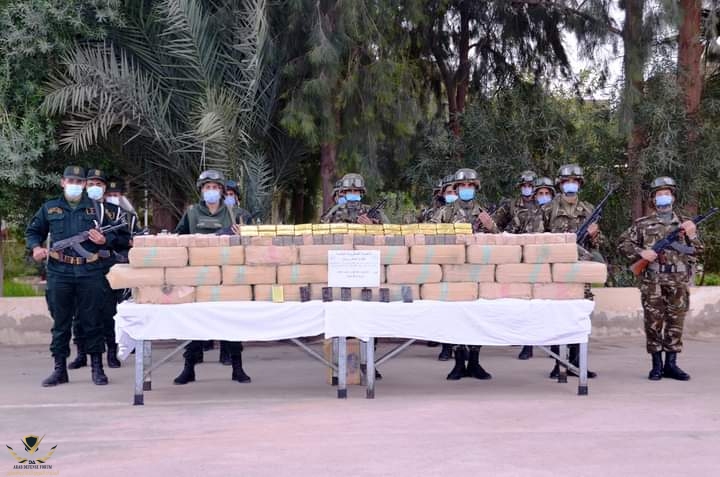 ففي إطار محاربة الجريمة المنظمة ومواصلة للجهود الحثيثة الهادفة لصد ظاهرة الاتجار بالمخدرات ببلادنا، أوقفت مفارز مشتركة للجيش الوطني الشعبي بالتنسيق مع مختلف مصالح الأمن (45) تاجر مخدرات وضبطت خلال عمليات متفرقة كميات ضخمة من الكيف المعالج تُقدر بـ(16) قنطار و(21,762) كيلوغرام تم إدخالها عبر الحدود مع المغرب.