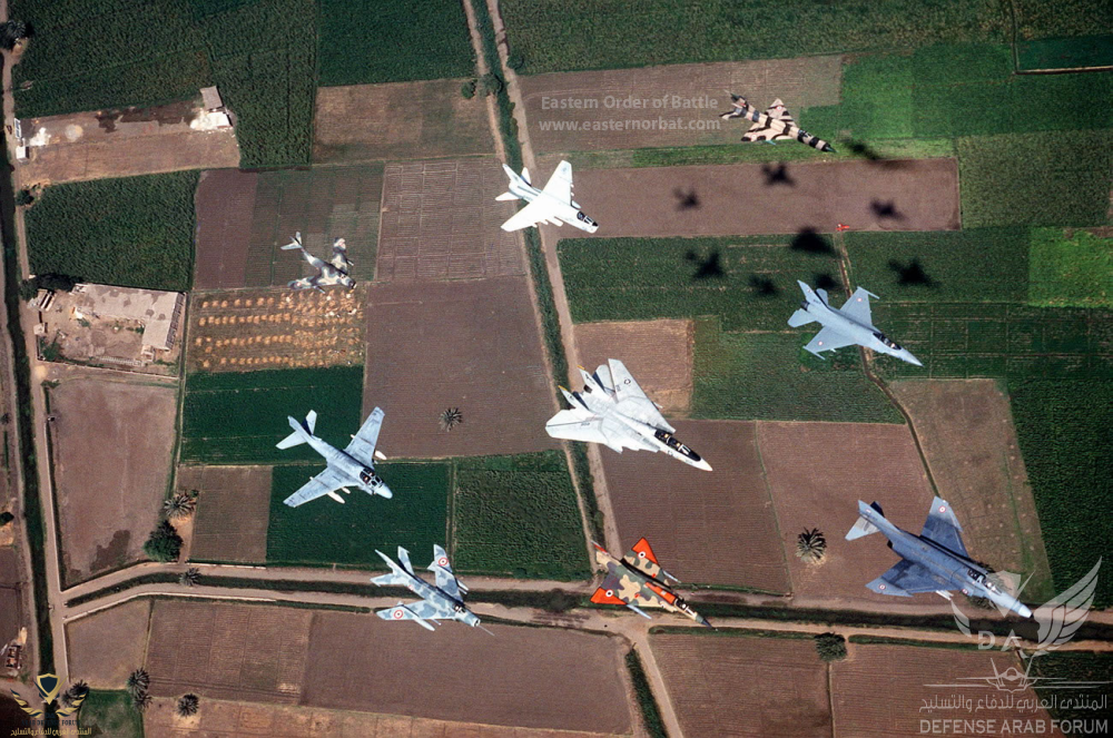 أفراد القوات الجوية المشاركة في التمرين يقفون خلف الطائرات المصرية المعروضة الطائرات من اليسار إلى اليمين ، هي طائرات من طراز MiG-15 و MiG-17 و MiG-21 و ميراج 2000 و اخيرا F-4 Phantom II