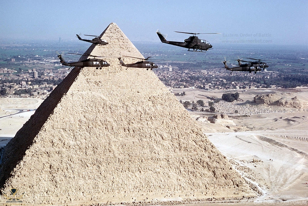 صورة لأربع طائرات من طراز F-111 وهي تحلق فوق الأهرامات أثناء التمرين Bright Star '83، 09/10/1983
