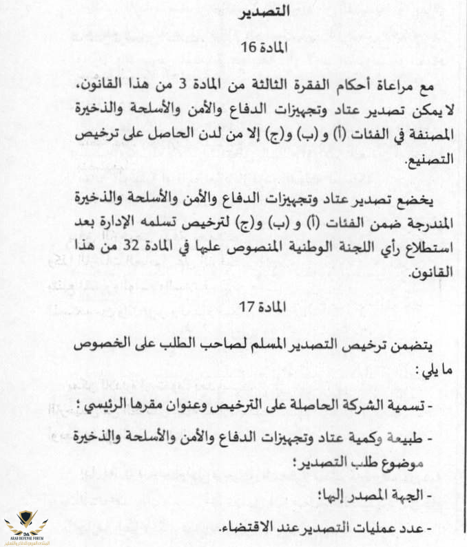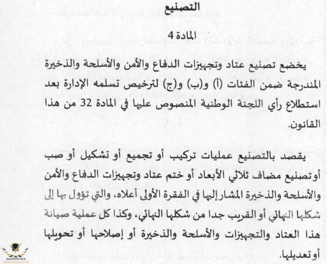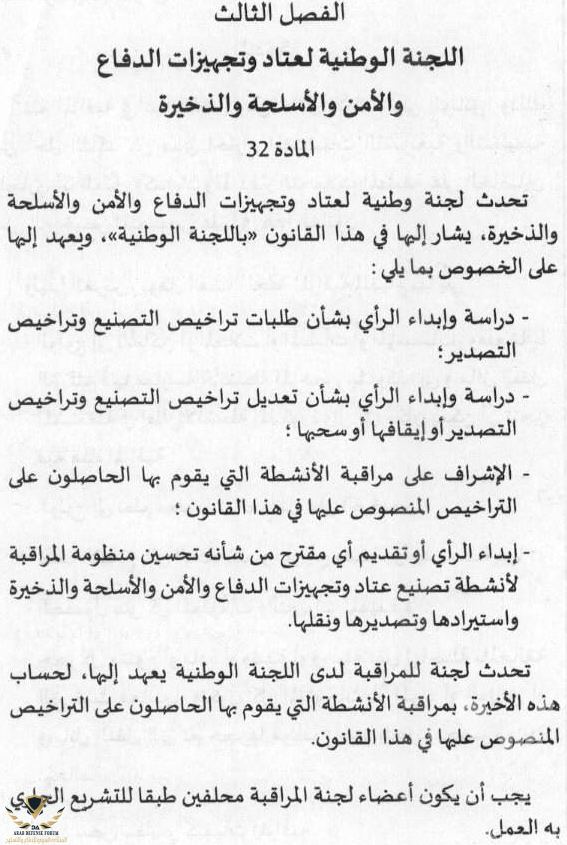 مشروع قانون رقم 10.20 يتعلق بعتاد وتجهيزات الدفاع والأمن والأسلحة والذخيرة المصادق عليه مؤخرا خلال المجلس الوزاري والذي أحيل على البرلمان لإستكمال المسطرة التشريعية يهدف أساسا إلى تقنين أنشطة التصنيع والتجارة والاستيراد والتصدير ونقل وعبور المعدات العسكرية من أهم ما جاء في هذا القانون هو إحداث لجنة وطنية ويعهد إليها :