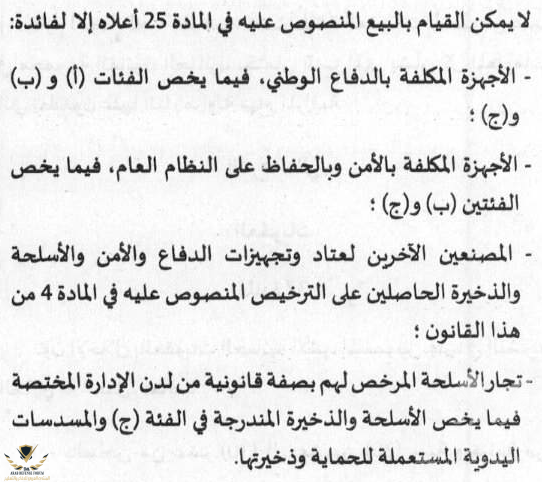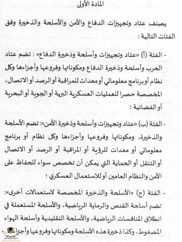 -تصنيفات عتاد وتجهيزات الدفاع والأمن والأسلحة والذخيرة حسب المادة الأولى :