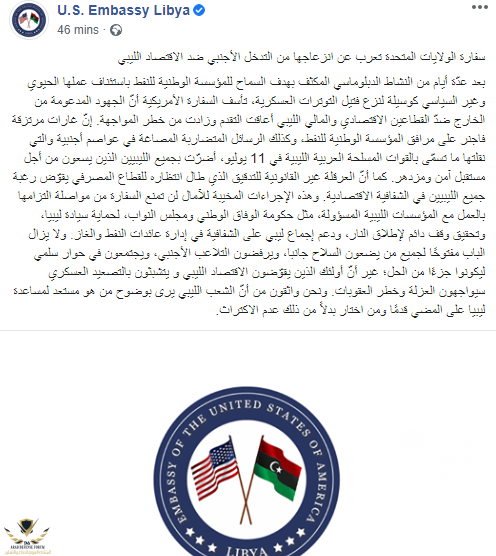 "لقد كان موقف المؤسسة الوطنية للنفط خلال المفاوضات واضحاً، فهي تدعم جميع الإجراءات التي من شأنها تحقيق الشفافية في الترتيبات المالية للدولة ، وتعارض أي تدابير تقوض أو تنتقص من السيادة الليبية. ويوضّح الإغلاق المتجدد الحاجة الملحة لاتخاذ خطوات من أجل تحسين الشفافية المالية يصاحبها إصلاح الترتيبات الأمنية في المنشآت النفطية".