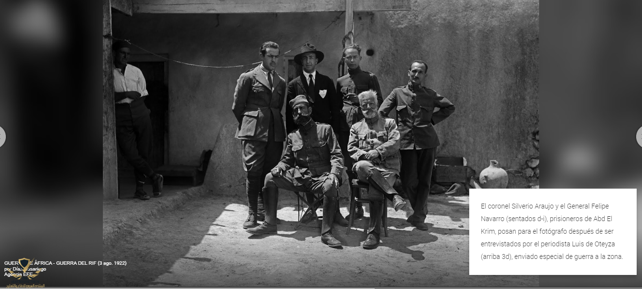 من اليسار الى اليمين الكولونيل اروخو الجنرال نافارو وليوتنون كولونيل مانويل لوبيز غوميز و ليوتنون كولونيل ادواردو لوبيز اورتيز و الكومندان خوسي غوميز تم تحريرهم بعد اسرهم في حرب الريف