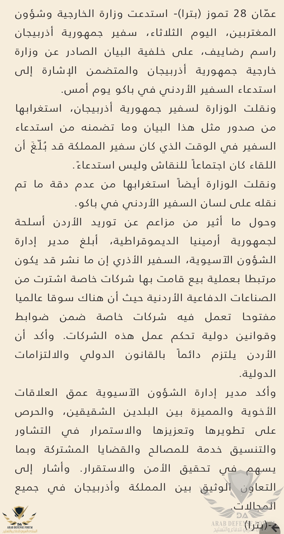 و لو عدنا لتاريخ كشف تزويد الأردن أرمينيا بالقاذف فهو في 24/7/2020 و في موقع أذري ناطق بالروسية يتم تمويله من الحكومة الأذرية ، يعني قبل 3 أيام فقط من إستدعاء السفير و الإحتجاج على ذلك ، أما خبر توريد منظومات SA-8 فهو يعود أصلاً إلى بداية شهر 6/2020 ، ولو هو المقصود كان شفنا هذا الإستدعاء و الإحتجاج في وقتها و ليس بعد قرابة الشهرين !!