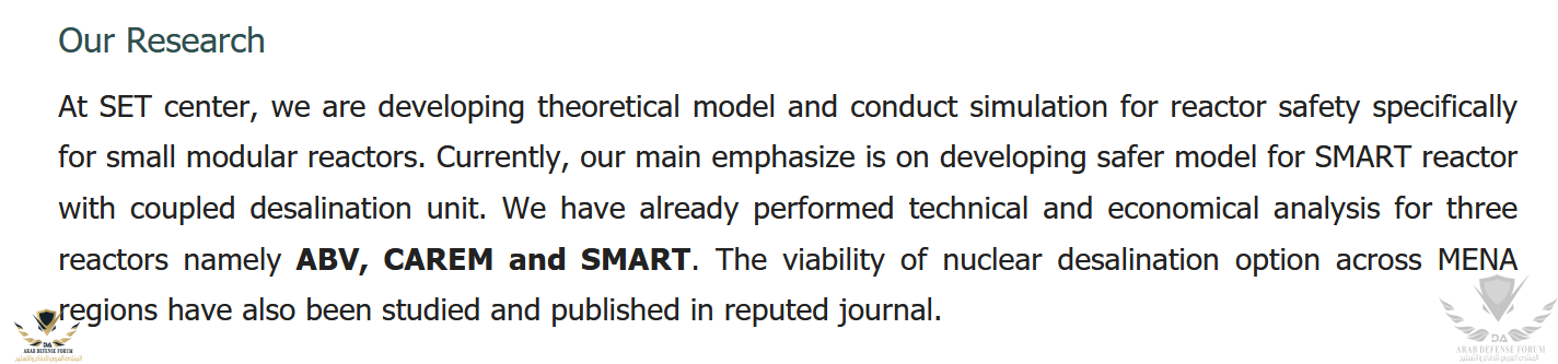 وفي فقرة أخرى:يهدف مشروع المفاعلات النووية المدمجة الصغيرة إلى توطين تقنية (سمارت) في المملكة والاستثمار المشترك في هذه التقنية من خلال بنائها داخليًا لدعم إنتاج الكهرباء وتحلية المياه