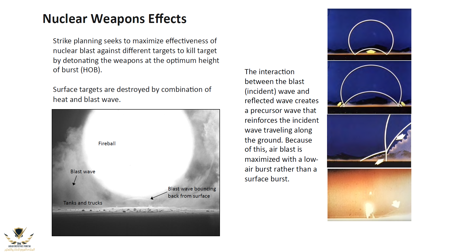 بالنسبة للتفجيرات النووية التي تحدث فوق سطح الأرض - الموجة الانفجارية لا تنتشر على السطح فقط بل لها إرتداد للأعلى وذلك يعود لأن التفجيرات النووية تحدث فوق سطح الأرض بمسافة!