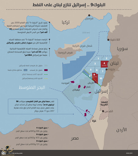 بالنسبة للبلوك 9 فيه جزء جنوبي منه وجزء جنوبي من بلوك 8 أكبر هو تحت سيطرة اسرائيل وحق لها بينما لبنان يطالب بما ليس له