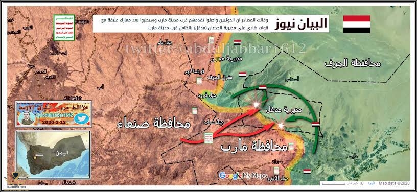 مقابل أنه هجم على مارب من مناطق حلحلان وماهليه ومجزر وستطاع أنه يسيطر عليها الكثير يعتقد ان الحوثي يريد أن يسقط مارب وهذا غير صحيح مجريات المعركه تؤاكد ان الحوثي يريد أن يسيطر على جميع المرتفعات الجبيله في المنطقه تبداء من صرواح وتنتهي في منطقه رغوان ولن يدخل في حرب صحراويه يريد أن يؤمن الجوف بالكامل وقطع خطوط الإمداد ويعيد تموضع قواته في مناطق جبليه ذات تحصين عالي وجعل له القدره الناريه على جميع المعسكرات التابعه للشرعيه هذا هوا تفكير الحوثي الحقيقي