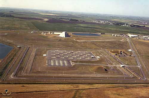 المبنى على شكل هرم هو رادار يستخدم لتتبع الصواريخ القادمة وتوجيه صواريخ سبرينت إلى أهدافها.