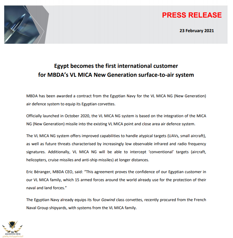 أعلنت اليوم شركة MBDA عن أن مصر هي أول زبون يتعاقد على منظومة صواريخ VL MICA NG