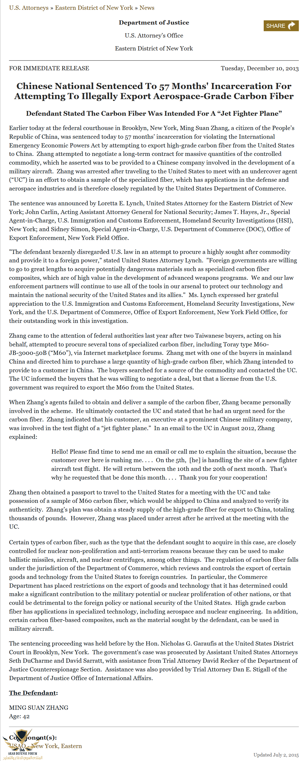 بخصوص الصين، في نهاية عام 2013 تم القبض على الصيني Ming Suan Zhang في محاولة منه لتصدير ألياف الكربون من الولايات المتحدة الأمريكية! فهل هذا يعني أن الصين ما زالت تعاني في صناعة مثل هذه المواد؟