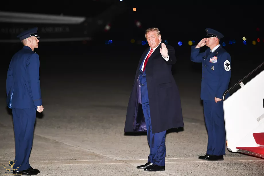 الرئيس ترامب يلوح بيده بعد خروجه من طائرة الرئاسة عند وصوله إلى قاعدة أندروز الجوية في ماريلاند عقب تجمع الحملة الانتخابية في مينيسوتا.