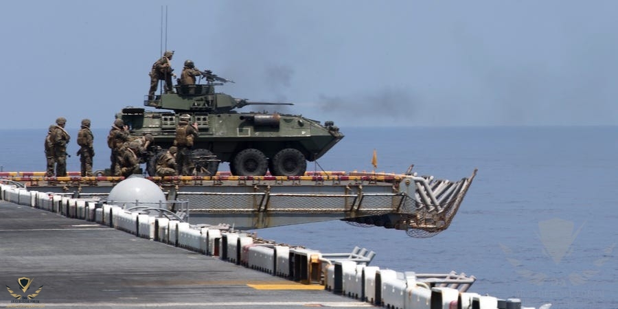 الصورة من سفينة الإنزال البرمائية USS Wasp والمدرعة ضمن تجهيز مشاة البحرية وتقوم بالرماية لغرض التمرين للطاقم اثناء الرحله .