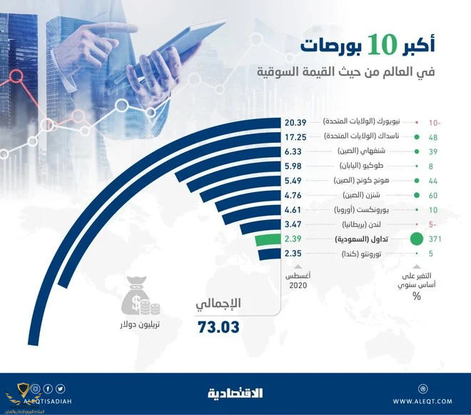 الله يقطعه من تداول واسواق مال73 تريليون دولار القيمة السوقية لأكبر 10 بورصات عالمية .. والسعودية تحتفظ بالمركز التاسع