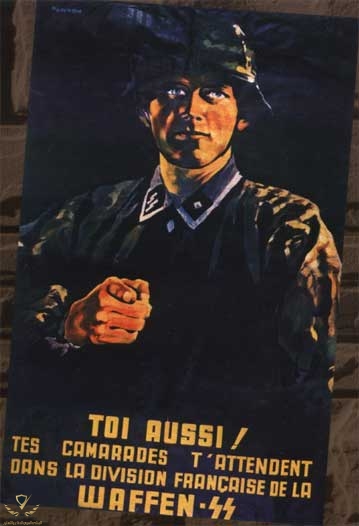 بوستر دعائي موجه الى الفرنسين بعد سقوط بلدهم للانضمام للقوات النازية