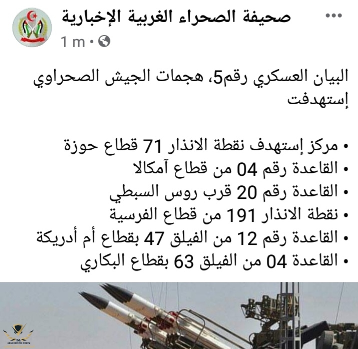 وضع مثير للشفقة ، بعد أن سلطت عليهم الأضواء حركو الپوليزاريو وحركو قنواتهم للكذب ليل نهار وتصوير مايقع الآن في هذا الوقت على أنه حرب و الطائرات تسقط ...هذ القواعد 3 ايام و هم يقصفونها ههه المشكلة انه لا وجود لهذه الاسماء بل هي اسماء عشوائية مختلقة![]()