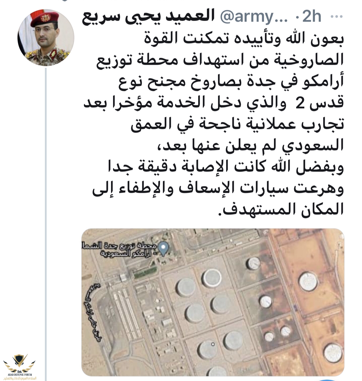 اعلان حوثي فجرا من الناطق الرسمي لهم عن استهدافهم محطة توزيع لارامكو بصاروخ كروز جديد فهل اجتازت كل نقاط الدفاع الجويمشاهدة المرفق 327118