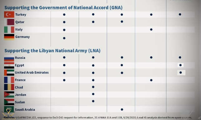 نشر المفتش العام الامريكي لوزارة الدفاع تقريرا عن عمليات مكافحة الارهاب في شرق وشمال وغرب افريقيا وذكر عن وصول الاطراف الليبية لاتفاق اطلاق النار وتم ذكر الدول الداعمة لكل طرف وما تقدم