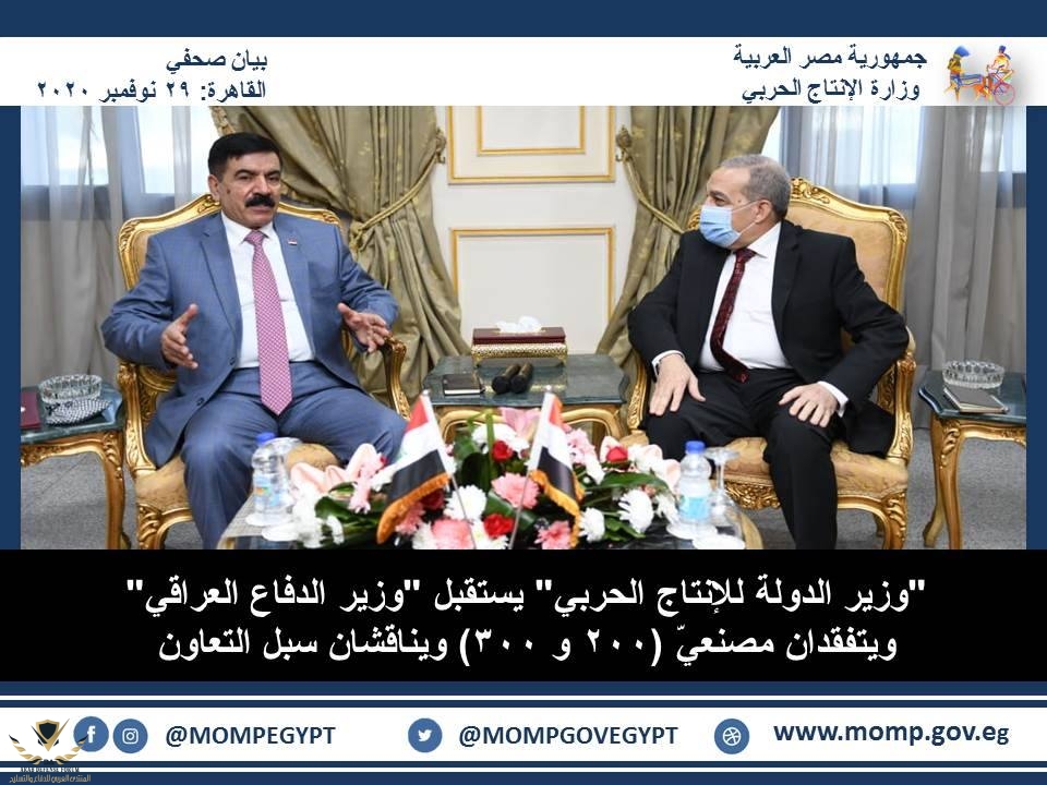تفقد وزير الدفاع العراقي، عناد سعدون، اليوم الأحد، مصنعين للإنتاج الحربي في مصر، برفقة وزير الدولة المصرية للإنتاج الحربي، محمد أحمد مرسي، وعدد من المسؤولين بالوزارتين