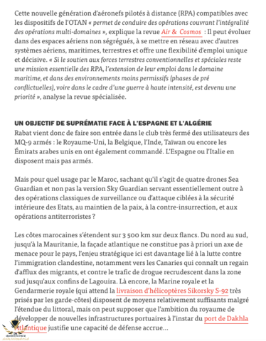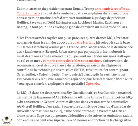 طعت الله شكون كي تصفح هاد موقع Goud.ma دير ليك غا طليلة على شنو كي لوحو ماعندهمش شيحاجة سميتها سبق صحفي او مصدر موثوق راه فحايلا صايبتي موقع اخباري و قعدتي كات نقل اخبار من موقع اخر تا هوا مغشوش فحالهمتزامنا مع زيارة الجنرال جايمس ماكونفيل الرباط اليوم لإجراء محادثات مع المسؤولين المغاربة حول الشراكة الإستراتيجية الأمريكية-المغربية خرجت إحدى المواقع الإخبارية نقلا عن جريدة “إل كونفيدونثيال” الصبليونية بخبر مراجعة أمريكا لصفقة بيع الدرونات mq-9b للمغرب رغم أني غير متأكد من مصداقية الخبر إلا أنني أريد بعض التوضيح من الإخوة ( مراحل تمرير الصفقة ، هل استوفت الشروط القانونية أي الموافقة من جميع المتدخلين) المهم أريد أن اطمإن و السلام