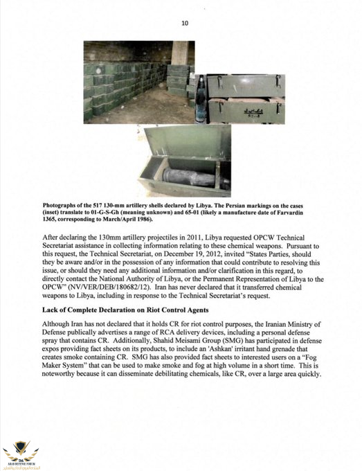 التقرير يقول ان إيران كانت تمتلك السلاح الكيمياوي غاز الخردل خلال الحرب الإيرانية العراقية وانها على اقل تقدير قد استخدمته بمعاركها لاحتلال البصرة 1987 ، كما اشار التقرير الى ان نظام معمر القذافي كان قد حصل على اسلحة كيمياوية من إيران على الرغم من نفي ايران المتكرر بعدم امتلاكها السلاح الكيمياوي