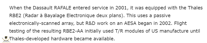 فقد استعانت طاليس في البداية اختبار الطيران الخاص RBE2-AA وحدات T/R من التصنيع الأمريكي حتى أصبحت الأجهزة التي طورتها شركة طاليس متاحة.