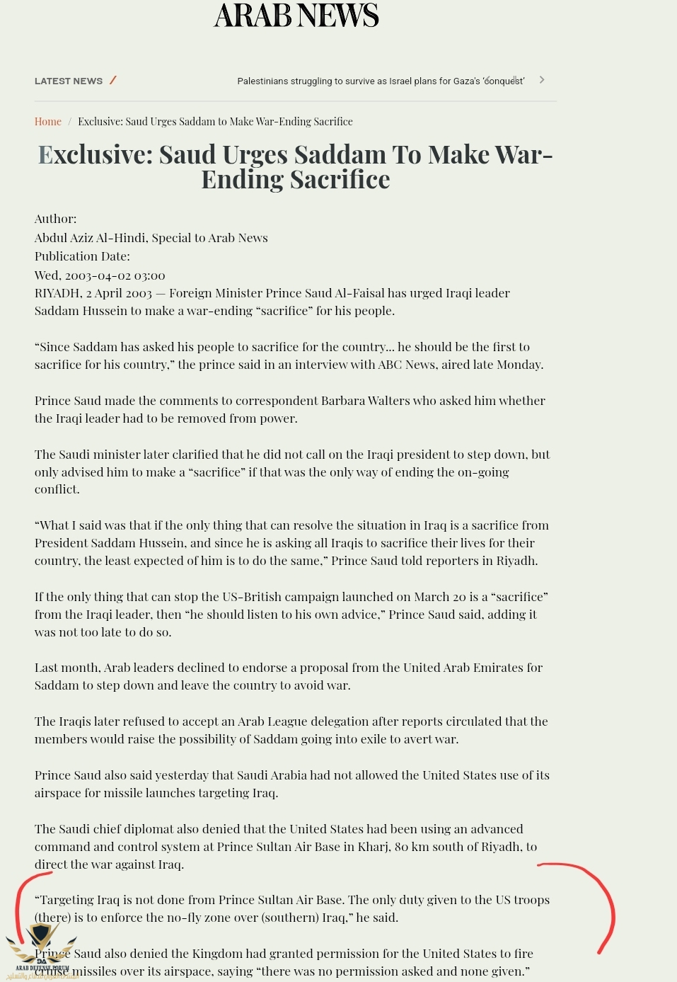 1) المملكة لم تسمح باستخدام قاعدة الأمير سلطان الجوية لصالح أمريكا في حرب العراق عام 2003، وإنما سمحت فقط بتنفيذ مهام منطقة الحظر الجوي. ما ذكرته يقتصر فقط على الطائرات اللوجستية والطائرات التي تقوم بمهام SEAD (قمع الدفاعات الجوية) في نطاق دفاعي، أليس كذلك؟ أما الطائرات الهجومية فقد أقلعت من دول مثل قطر والكويت.
