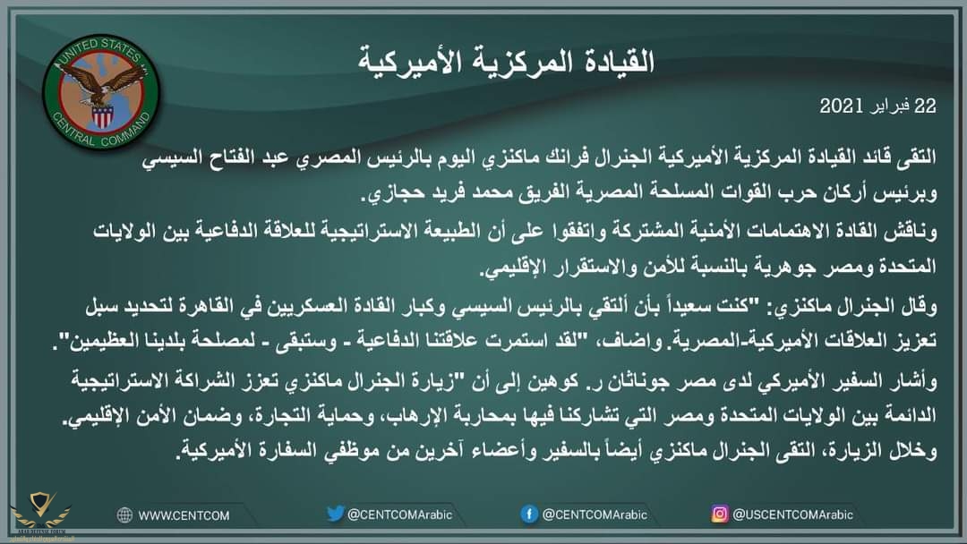 وصرح السفير بسام راضي، المتحدث الرسمي باسم رئاسة الجمهورية، بأن الرئيس رحب بقائد القيادة المركزية الأمريكية في زيارته إلى مصر، مؤكداً خصوصية العلاقات الإستراتيجية الراسخة بين مصر والولايات المتحدة الأمريكية، والتطلع لاستمرار تطوير التعاون الثنائي القائم في جميع المجالات خاصةً على الصعيد العسكري القائم والممتد بين البلدين على مدار العقود الماضية، وذلك على نحو يعزز من التعاون المثمر بين مصر والولايات المتحدة في مواجة اهلتحديات المشتركة في المنطقة.
