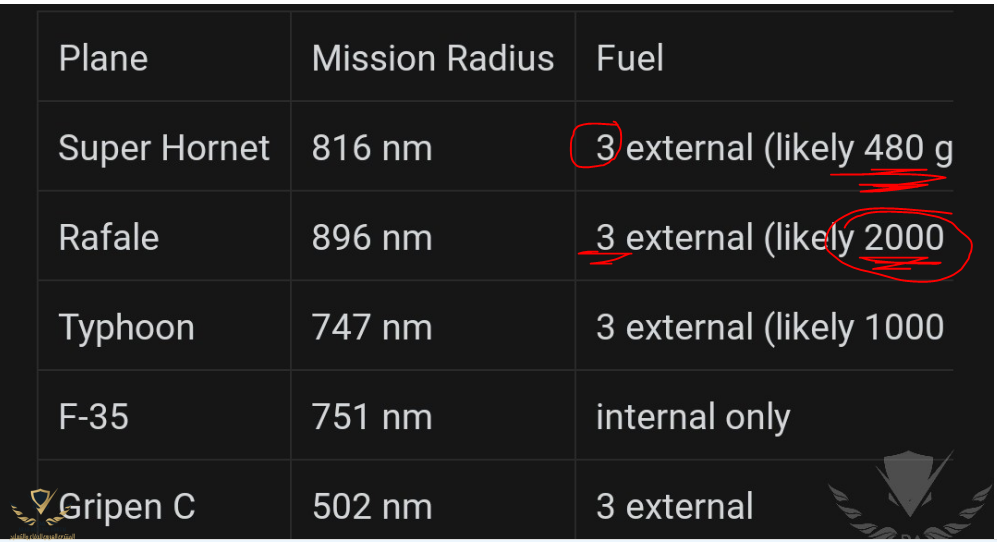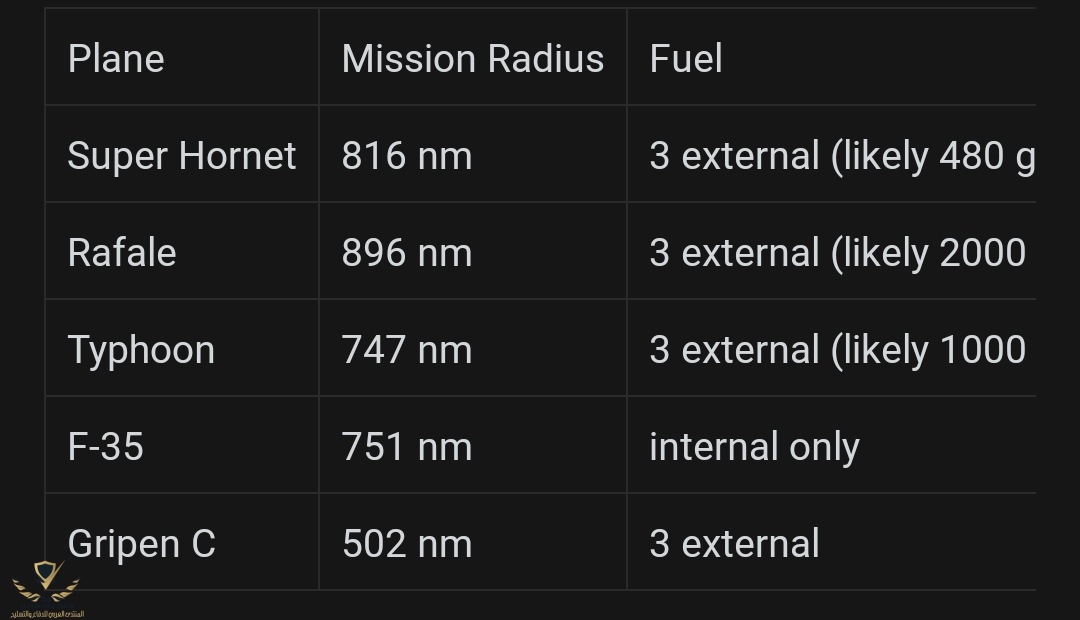 * على الرغم ان السوبر هورنيت تحمل حوالي 1.7 طن وقود اكثر من الرافال .. الا ان مدى الرافال اكبر من مدى السوبر هورنيت