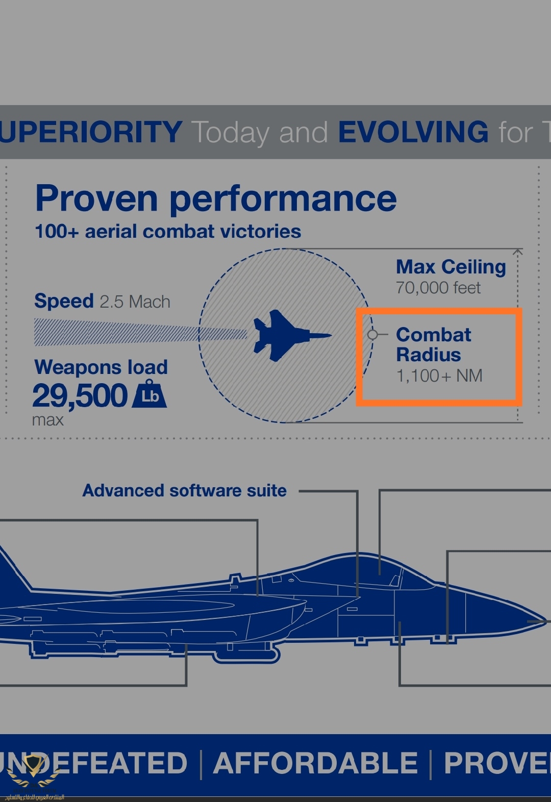 * كما اوضحت في موضوع سابق فان الخزانات الكتفية توفر زيادة في مدى الرافال من 20% وحتى 25% .. بينما توفر زيادة في الوقود مقدارها حوالي 20% عن الوقود الذي تحمله في مهام القتال الجوي التي سبق ذكرها .. وبالتالي لو اخذنا الحد الادنى لزيادة المدى الذي توفره تلك الخزانات الكتفية وهو 20% واضفناه الى المدى القتالي للرافال في مهمة جو- جو يصبح المدى القتالي للرافال في نفس المهمة اكثر من 1100 ميل بحري .. وهو نفس المدى القتالي الذي تتفاخر به بوينج لمقاتلتها الاف 15 ادفانسد على موقعها الرسمي