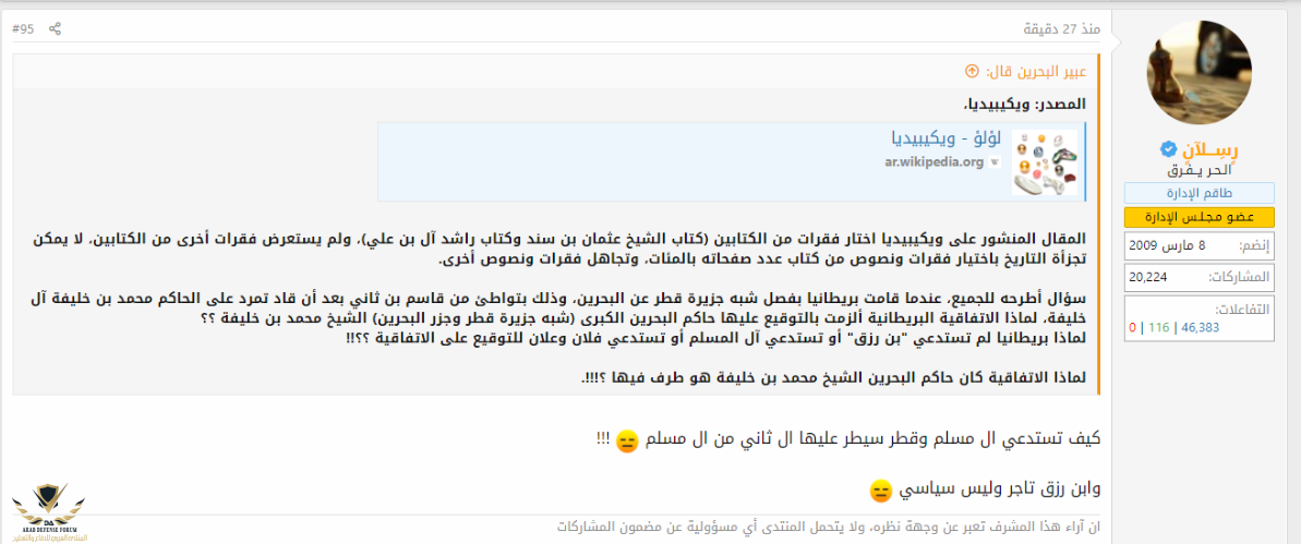 رجاءً اصطف على جنب، وبالبحريني مثل ما نقول "خليك على كتر" وخليك فقط قارئ، واترك النقاش لمن يعرفون الحقائق التاريخية عن حكم آل خليفة في شبه جزيرة قطر، وكيفية استقلال شبه جزيرة قطر عن البحرين، اترك لهم المجال يشتغلون بالموضوع ويدرجون مشاركات فيها معلومات ذات قيمة وفقاً لقراءاتهم واطلاعاتهم على الوثائق التاريخية والسيّر،